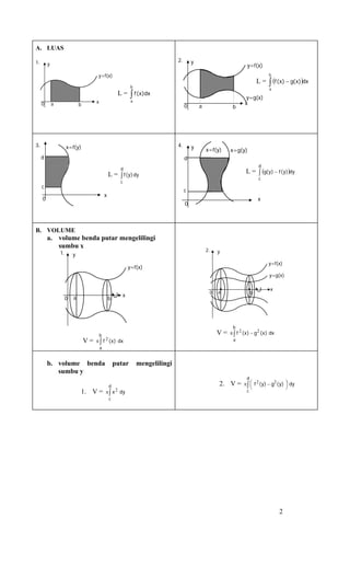 Dokumen ini adalah ringkasan materi kalkulus kelas XII yang mencakup pengertian integral, baik tertentu maupun tak tertentu, serta penerapan dan rumus-rumus terkait. Terdapat juga rumus integral untuk fungsi trigonometri dan latihan soal untuk memahami konsep-konsep tersebut. Semua topik ditujukan untuk memberikan pemahaman mendalam tentang pengintegralan dalam matematika.