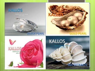 The document describes Kallos, a line of loofahs and soaps for skin rejuvenation. It provides details on 4 types of loofahs - Gold Pearl with almond and dead sea extracts for anti-aging and glowing skin, Silver Pearl containing olive oil for moisturizing and repairing sun damage, Sea Extract for stress relief and skin rejuvenation, and Rose for cleansing and treating acne. It also mentions a body wash and bundle offers. The company caters to urban areas in India and some tier-2 cities, using renowned distribution channels across the country. It promotes the products through social media, sample packs, TV and radio advertisements, and print media.