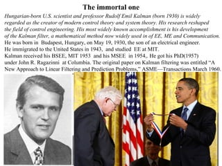 The document discusses Rudolf Kalman and his development of the Kalman filter, a mathematical method widely used in fields such as electrical engineering, mechanical engineering, and communications. It provides background on Kalman, an overview of the Kalman filter and how it works, and examples of its applications, notably in enabling the Apollo 11 moon landing through its use in the spacecraft's guidance system. The Kalman filter provides an efficient recursive solution to problems of discrete-time data filtering and estimation in dynamic systems with random noise.