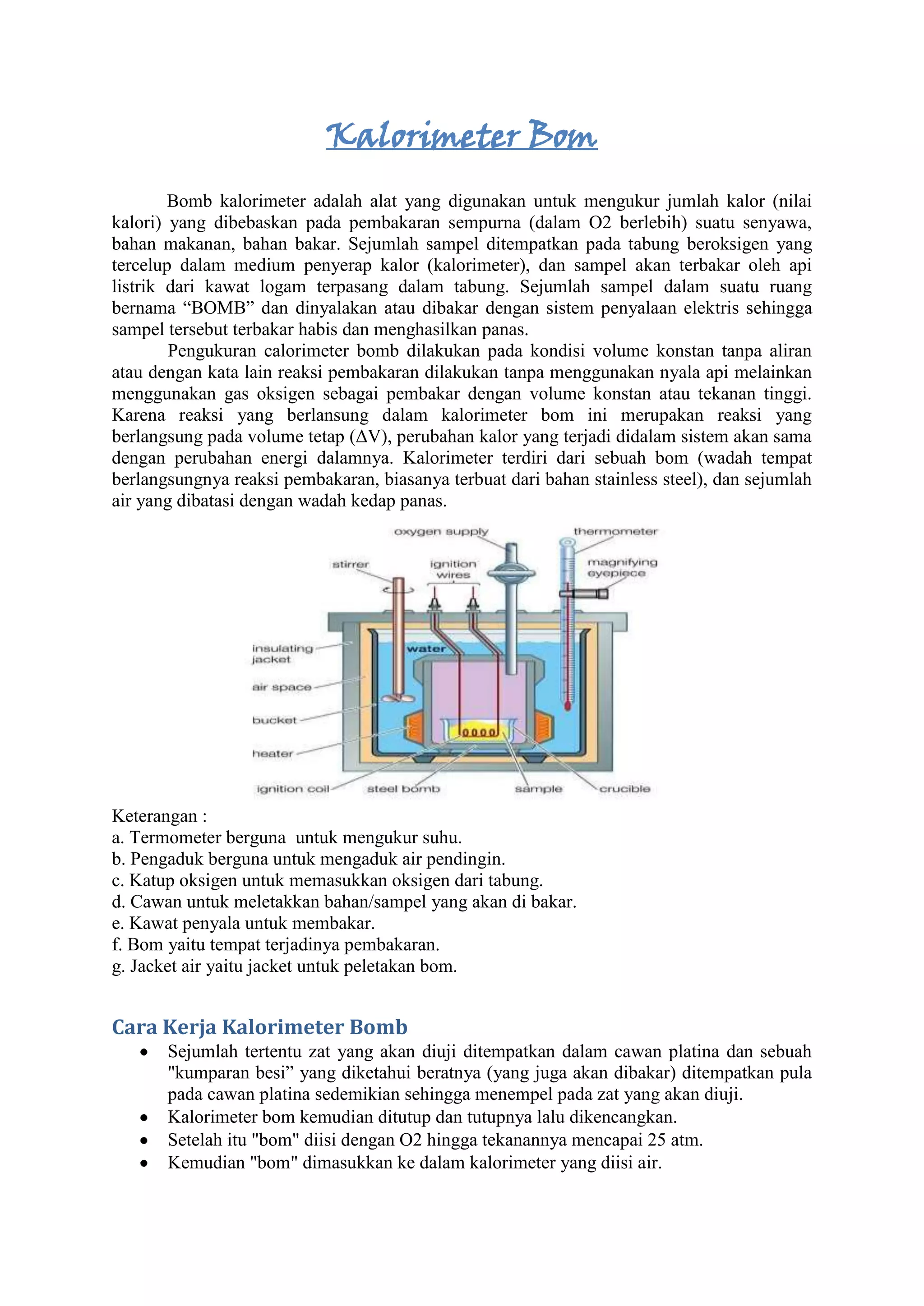 Kalorimeter bom adalah alat yang digunakan untuk mengukur kalori yang dilepaskan saat pembakaran sempurna suatu zat. Zat sampel dibakar di dalam tabung beroksigen yang tercelup di dalam air (kalorimeter). Panas hasil pembakaran akan diserap air, sehingga kenaikan suhunya dapat diukur untuk menentukan kalori zat sampel. Prinsipnya bekerja pada sistem terisolasi di mana kalori reaksi sama dengan kalori