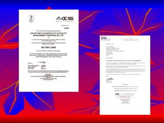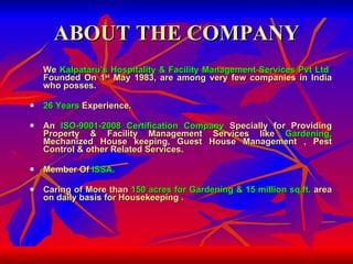 Kalpataru's Hospitality & Facility Management Services is an ISO 9001-2008 certified company that has been providing property and facility management services for 26 years. It aims to exceed customer expectations and provide services to international standards. The company provides a wide range of services including housekeeping, gardening, pest control, guest house management, and more. It has a well-defined management structure and trains its employees to ensure quality service.