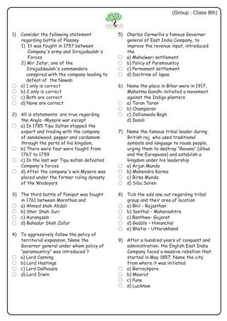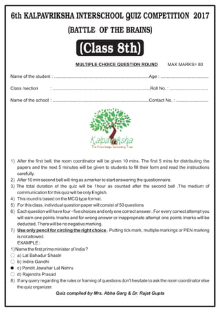 This document outlines the rules and format for a 50 question multiple choice quiz competition for class 8 students. It provides details on the duration, marking scheme, and prohibited activities. Sample questions cover topics in Indian history, geography and the constitution.