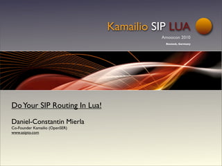 The document presents an overview of using Lua scripting within the Kamailio SIP router for enhanced SIP routing capabilities. It highlights the benefits of Lua, including its speed, simplicity, and integration potential with other communication platforms. The document also introduces a specific application, 'sipweet,' which allows for Twitter integration to send notifications on SIP events like missed calls.