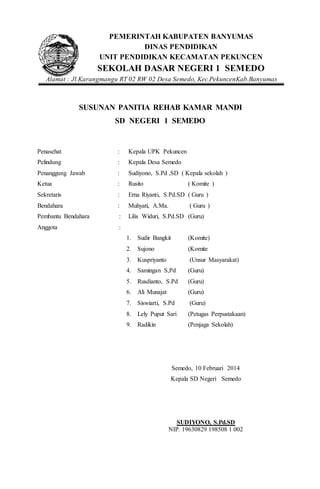 SD Negeri 1 Semedo mengajukan permohonan dana sebesar Rp 40.000.000 untuk perbaikan kamar mandi dan WC siswa yang dalam keadaan rusak berat. Proposal ini diajukan kepada Dinas Pendidikan Kabupaten Banyumas untuk mendukung sarana dan prasarana pendidikan guna menciptakan lingkungan belajar yang aman dan nyaman. Kerjasama dengan berbagai pihak diharapkan dapat merealisasikan perbaikan ini yang penting bagi proses belajar mengajar.