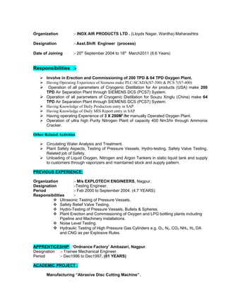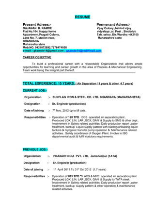 Gajanan Kamde is a mechanical engineer with over 15 years of experience in air separation and related fields. He currently works as a senior engineer at Sunflag Iron & Steel, where he operates a 120 TPD air separation plant. Previously, he worked at Praxair India and Inox Air Products, gaining experience operating larger air separation plants and in roles like process engineering. He seeks to further his career in process and mechanical engineering with opportunities for learning and growth.