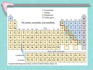 The document summarizes key information about the periodic table, including that there are 118 known elements as of 2010, with 94 found naturally on Earth. It describes how chemistry was disorganized before the periodic table was developed by Dmitri Mendeleev, who arranged elements in rows by atomic weight and columns by chemical properties, leaving spaces for undiscovered elements. The current periodic table arranges elements by atomic number in rows called periods and columns called groups, which have similar properties based on their valence electrons. Key groups described include alkali metals, alkaline earth metals, transition metals, and noble gases.