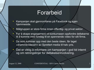 Forarbeid Kampanjen skalgjennomføres på Facebook og egen hjemmeside. Målgruppen er store firma innen offentlig- og privat sektor. For å skape engasjement vil konkurrasen oppfordre deltakerne til å komme med forslag til en spennende video for sitt firma. De som kommer opp med den beste ideen, får laget «drømmevideoen» av Sprettert media til halv pris. Det er viktig å informere om kampanjen i god tid internt og om retningslinjer for deltakelse/involvering.