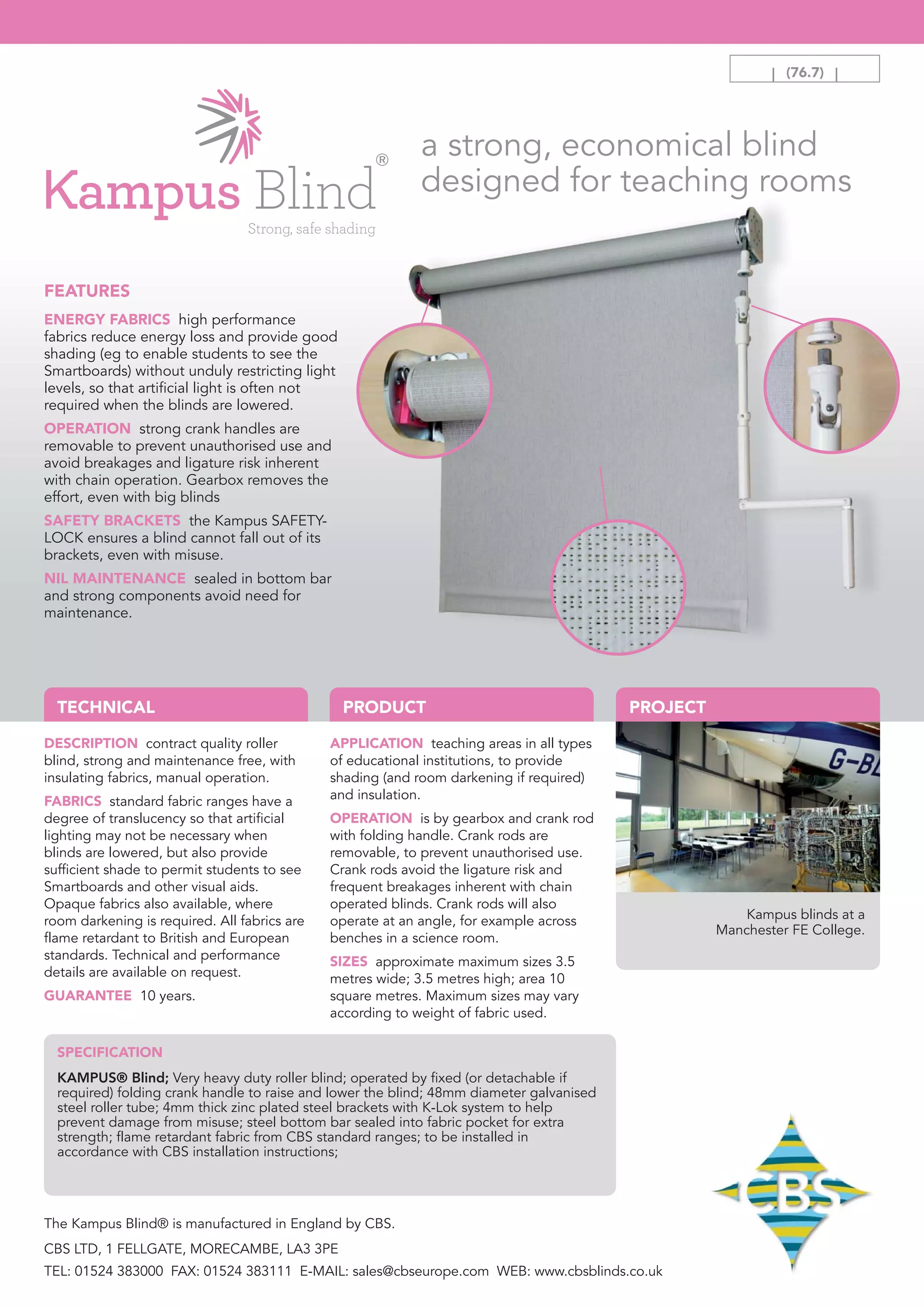 The document describes a technical product project for the Kampus Blind, a strong, maintenance-free roller blind designed for teaching rooms. It has insulating fabrics, a manual crank operation, and safety features. Standard fabrics allow light transmission while providing shade, and opaque options are available where complete room darkening is required. The blind has a 10-year guarantee and is suitable for use in educational institutions.