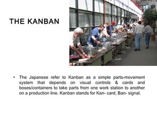 The Kanban system is a Japanese production system that uses visual signals like cards and containers to control the flow of parts between workstations. Only the necessary components are delivered from suppliers to the production line as needed to avoid excess storage. Each workstation only produces enough parts to fill an empty container before stopping in order to limit inventory levels in the process.