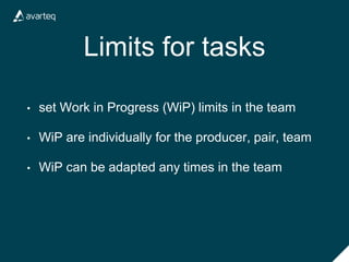 The document outlines the importance of setting work in progress (WIP) limits in a Kanban system to enhance workflow and minimize bottlenecks. It emphasizes the need for individual WIP limits for team members, as well as the necessity of managing input queues and buffers to optimize processes. Additionally, it discusses the importance of avoiding pressure on the team while ensuring continuous improvement through the proper implementation of WIP limits.