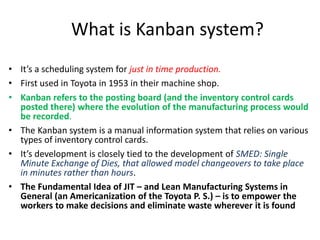 Kanban systems are a scheduling and inventory management method used in lean manufacturing. Some key points: