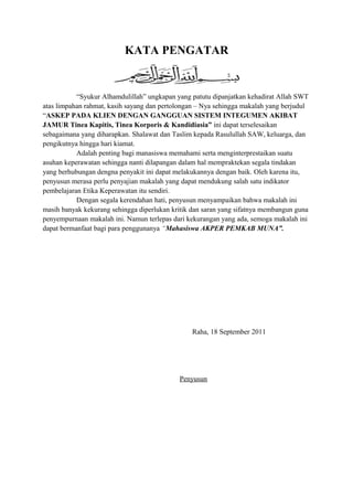 Makalah ini membahas tentang tiga penyakit yaitu tinea kapitis, tinea korporis, dan kandidiasis. Tinea kapitis adalah kelainan pada kulit dan rambut kepala, sedangkan tinea korporis adalah dermatofitosis pada kulit berrambut halus. Kandidiasis disebabkan oleh jamur Candida yang dapat menginfeksi berbagai bagian tubuh seperti mulut, vagina, dan paru-paru. Makalah ini menjelaskan