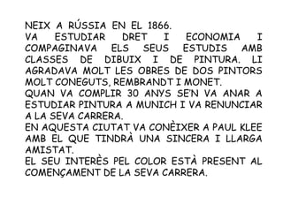 Wassily Kandinsky was born in Russia in 1866. He studied law and economics but also took drawing and painting classes. He was inspired by the works of famous painters Rembrandt and Monet. When he turned 30 years old, he decided to abandon his career path to study painting in Munich. There he befriended Paul Klee, forming a sincere and long-lasting friendship. His interest in color was already present early in his artistic career as shown through works like Squares with Concentric Circles, Various Circles, Color Studies, Composition VIII, Yellow, Red and Blue, Blue Sky, and Gravitation.