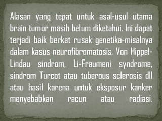 Tumor atau pertumbuhan sel kanker di otak dapat menyebabkan tekanan pada jaringan otak dan gangguan berbagai fungsi otak seperti visi, pidato, dan keseimbangan karena otak terletak di dalam tengkorak. Gejala awal kanker otak meliputi sakit kepala berkepanjangan, mual berulang, dan rasa lemas.