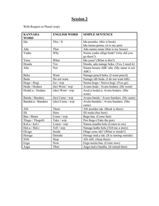 This document provides introductory Kannada words and phrases for common greetings, family relations, numbers, vegetables, fruits, and colors. It includes the Kannada terms, English translations, and basic sample sentences. The document is divided into 4 sessions that progressively build vocabulary within each category from basic words and structures to more advanced terms and examples.