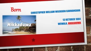 Christopher William Wijekoon Kannangara was born in 1884 in southern Sri Lanka. He became a teacher and lawyer, and joined the temperance movement led by Anagarika Dharmapala. Kannangara entered politics through the Ceylon National Congress and was elected to the Legislative Council in 1923. He was then elected the first chairman of the Executive Committee of Education in the State Council in 1931, becoming the first Minister of Education of Sri Lanka. As education minister, Kannangara established reforms including introducing free education, using local languages as the medium of instruction, and establishing central schools and the University of Ceylon.