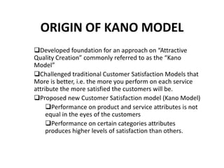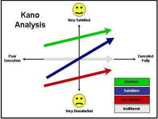 The document discusses the Kano model developed by Noriaki Kano, focusing on customer satisfaction and quality characteristics, categorizing attributes into dissatisfiers, satisfiers, and delighters. It compares various products, including smartphones and cars, evaluating criteria like display, memory, and performance, ultimately highlighting the strengths of competing models. The conclusion emphasizes the need for each product to address specific customer attributes to enhance satisfaction.