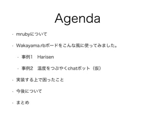 Agenda • mrubyについて • Wakayama.rbボードをこんな風に使ってみました。 •