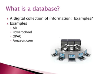 This document provides tips for effectively researching using digital databases. It discusses accessing the Kansas Library Card and EBSCO databases, the differences between basic and advanced searching, and search techniques like using subject terms, Boolean operators, quotation marks, wildcards and truncation to refine results. Databases are recommended over general internet searches as they contain vetted sources and provide citation formatting. The document aims to teach students how to search efficiently and evaluate results.