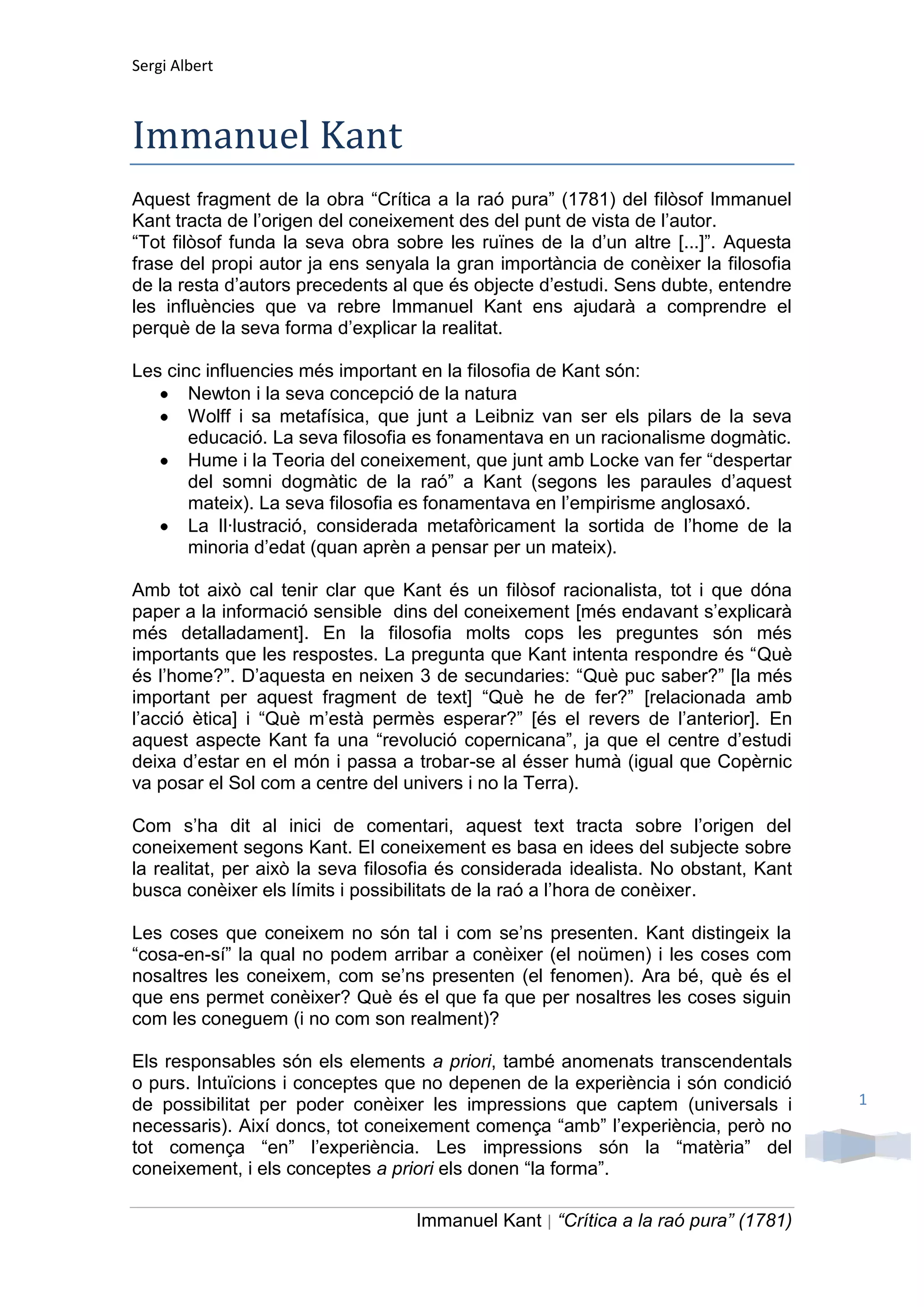 Immanuel Kant<br />Aquestfragment de la obra “Crítica a la raó pura” (1781) del filòsof Immanuel Kant tracta de l’origen del coneixement des del punt de vista de l’autor. <br />“Tot filòsof funda la seva obra sobre les ruïnes de la d’un altre [...]”. Aquesta frase del propi autor ja ens senyala la gran importància de conèixer la filosofia de la resta d’autors precedents al que és objecte d’estudi. Sens dubte, entendre les influències que va rebre Immanuel Kant ens ajudarà a comprendre el perquè de la seva forma d’explicar la realitat.<br />Les cinc influencies més important en la filosofia de Kant són:<br />Newton i la seva concepció de la natura<br />Wolff i sa metafísica, que junt a Leibniz van ser els pilars de la seva educació. La seva filosofia es fonamentava en un racionalisme dogmàtic.<br />Hume i la Teoria del coneixement, que junt amb Locke van fer “despertar del somni dogmàtic de la raó” a Kant (segons les paraules d’aquest mateix). La seva filosofia es fonamentava en l’empirisme anglosaxó.<br />La Il·lustració, considerada metafòricament la sortida de l’home de la minoria d’edat (quan aprèn a pensar per un mateix).<br />Amb tot això cal tenir clar que Kant és un filòsof racionalista, tot i que dóna paper a la informació sensible dins del coneixement [més endavant s’explicarà més detalladament]. En la filosofia molts cops les preguntes són més importants que les respostes. La pregunta que Kant intenta respondre és “Què és l’home?”. D’aquesta en neixen 3 de secundaries: “Què puc saber?” [la més important per aquest fragment de text] “Què he de fer?” [relacionada amb l’acció ètica] i “Què m’està permès esperar?” [és el revers de l’anterior]. En aquest aspecte Kant fa una “revolució copernicana”, ja que el centre d’estudi deixa d’estar en el món i passa a trobar-se al ésser humà (igual que Copèrnic va posar el Sol com a centre del univers i no la Terra).<br />Com s’ha dit al inici de comentari, aquest text tracta sobre l’origen del coneixement segons Kant. El coneixement es basa en idees del subjecte sobre la realitat, per això la seva filosofia és considerada idealista. No obstant, Kant busca conèixer els límits i possibilitats de la raó a l’hora de conèixer.<br />Les coses que coneixem no són tal i com se’ns presenten. Kant distingeix la “cosa-en-sí” la qual no podem arribar a conèixer (el noümen) i les coses com nosaltres les coneixem, com se’ns presenten (el fenomen). Ara bé, què és el que ens permet conèixer? Què és el que fa que per nosaltres les coses siguin com les coneguem (i no com son realment)?<br />Els responsables són els elements a priori, també anomenats transcendentals o purs. Intuïcions i conceptes que no depenen de la experiència i són condició de possibilitat per poder conèixer les impressions que captem (universals i necessaris). Així doncs, tot coneixement comença “amb” l’experiència, però no tot comença “en” l’experiència. Les impressions són la “matèria” del coneixement, i els conceptes a priori els donen “la forma”.<br />Aquestes són les bases de la teoria del coneixement d’Immanuel Kant: l’idealisme transcendental. Entre els conceptes que té el subjecte s’hi poden establir diferents relacions, és a dir, diferents judicis (recordem que per un judici calien com a mínim dos conceptes). Kant distingeix dos tipus de judicis, i al seu temps aquests poden ser de dos tipus, en funció del coneixement al que es refereixin:<br />Són judicis analítics aquells que expressen en el predicat una informació que ja està continguda en el subjecte.<br />Són judicis a priori ja que la veritat pot ser coneguda independentment de la experiència.<br />Són judicis a posteriori si la veritat és coneguda a partir de la experiència. No obstant, aquests tipus de judicis són impossibles ja que un judici analític no pot dependre d’una experiència prèvia.<br />Són judicis sintètics aquells que expressen del contingut algun coneixement nou.<br />Són judicis a posteriori ja que la veritat és coneguda a partir de la experiència.<br />Són judicis sintètics a priori si aporten un coneixement nou sobre i són universals i necessaris. Segons Kant, la ciència és possible com a coneixement veritable gràcies a aquests tipus de judicis.<br />Kant no es limita a descriure com es regeixen les estructures del coneixement, sinó que a més a més explica les facultats que permeten a hom conèixer. Kant enuncia les diferents ciències que estudien les facultats del coneixement, i al seu temps les ciències que estudien els elements purs d’aquestes facultats (és a dir, ciències que utilitzen judicis sintètics a priori).<br />La estètica transcendental és la ciència que estudia la sensibilitat: aquesta facultat del coneixement que ens permet rebre informació de l’exterior (de forma passiva). L’individu rep un caos d’impressions que l’espai i el temps (dos intuïcions pures de la sensibilitat) ordenen i organitzen.<br />La ciència que estudia l’espai i el temps és la matemàtica: el primer amb la geometria i el segon amb l’aritmètica. Per tant, aquesta ciència elabora judicis sintètics (aporten nou coneixement) a priori (sobre elements purs, universals i necessaris).<br />L’analítica transcendental és la ciència que estudia com l’enteniment comprèn la sensibilitat. L’enteniment elabora conceptes i formula judicis mitjançant relacions entre els primers. Aquestes activitats intel·lectuals pròpies de l’enteniment es duen a terme mitjançant conceptes purs, les categories (12 en total), eines que ens permeten organitzar el coneixement sensible per poder entendre els fenòmens.<br />La física és el resultat d’aquest procés mental. Aporta coneixement nou sobre elements purs.<br />La dialèctica transcendental és la ciència que estudia la raó. Aque