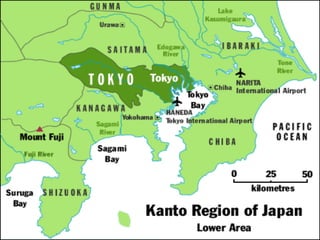 - The Kanto region is a geographical area of Honshu island in Japan that includes the greater Tokyo area and the prefectures of Gunma, Tochigi, Ibaraki, Saitama, Tokyo, Chiba, and Kanagawa. It is known for landmarks like Tokyo and Kamakura, as well as famous cuisines including monja-yaki from Tokyo and namerou from Chiba.