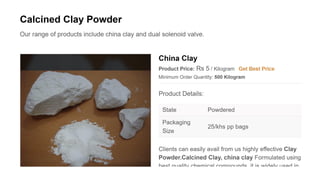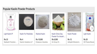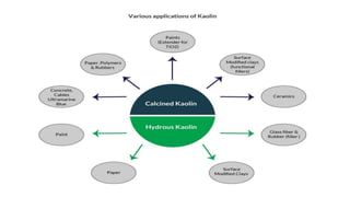 Kaolin is a non-metallic mineral composed mainly of kaolinite and other minerals. It is widely used in ceramics, paper, rubber, plastics and refractory industries due to its excellent processabilities. There are two main processes for processing kaolin ore - dry and wet processes. The dry process produces hard kaolin while the wet process produces soft kaolin.