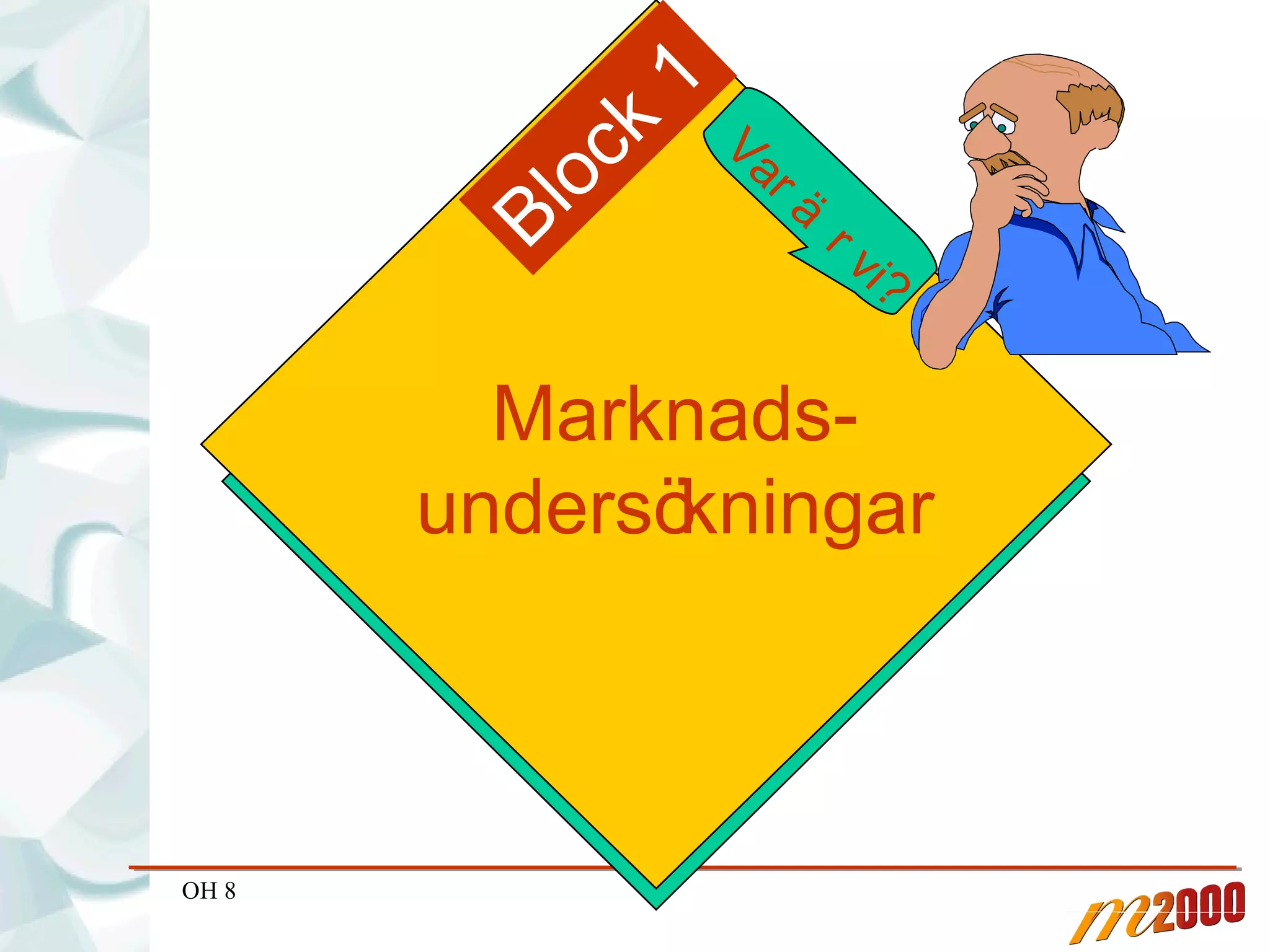 Marknadsundersökningar Att lyssnapå kunden Information – en av företagets viktigaste resurser Information är makt Företagets handlande styrs av den information företaget har Målet är att bli ett ”intelligent” eller ”lärande företag! OH 8:1