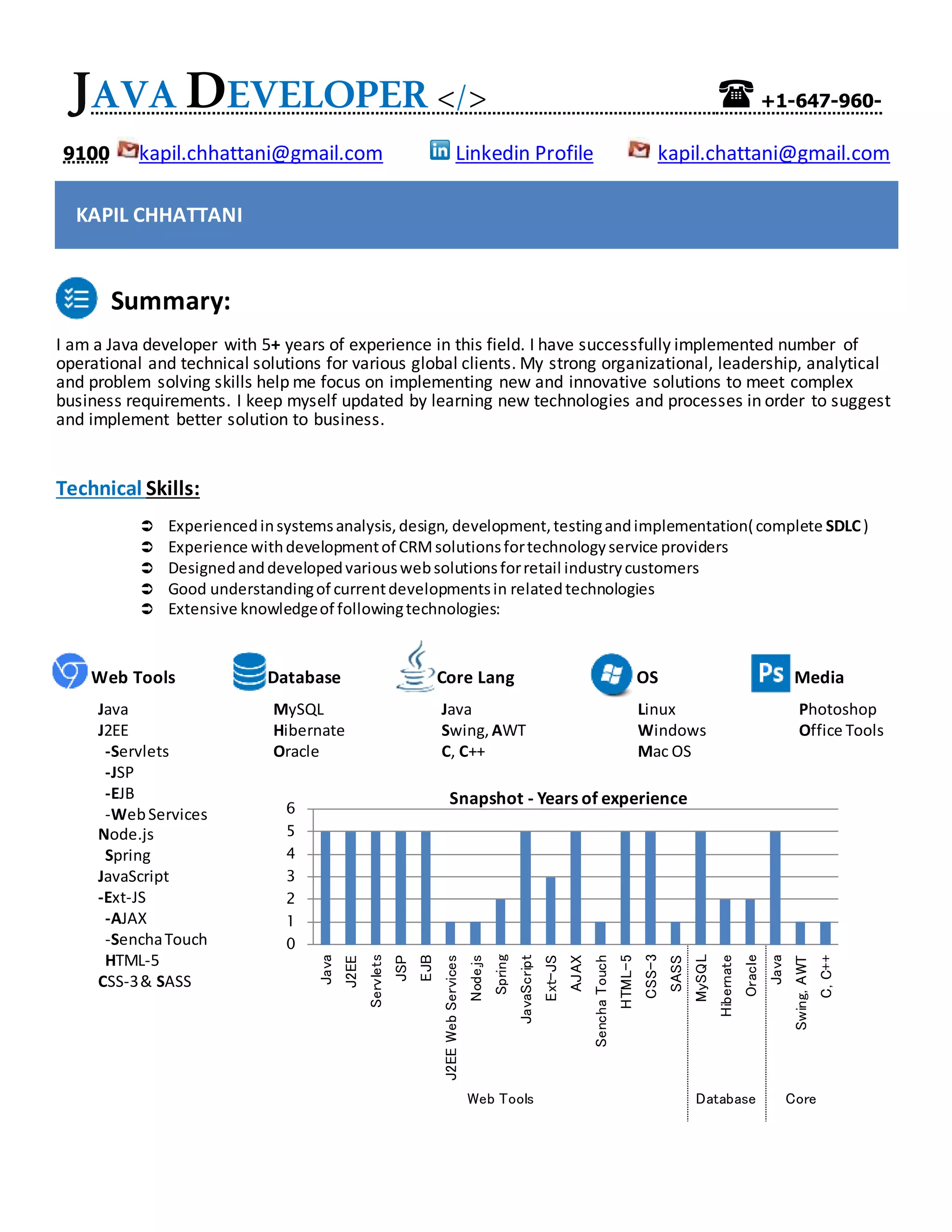 Kapil Chhattani is a Java developer with over 5 years of experience developing solutions for clients across various industries. He has strong technical skills in Java, J2EE, MySQL, and Node.js and has experience leading projects from design through implementation. His background includes developing CRM solutions, web applications, and an employee management system.