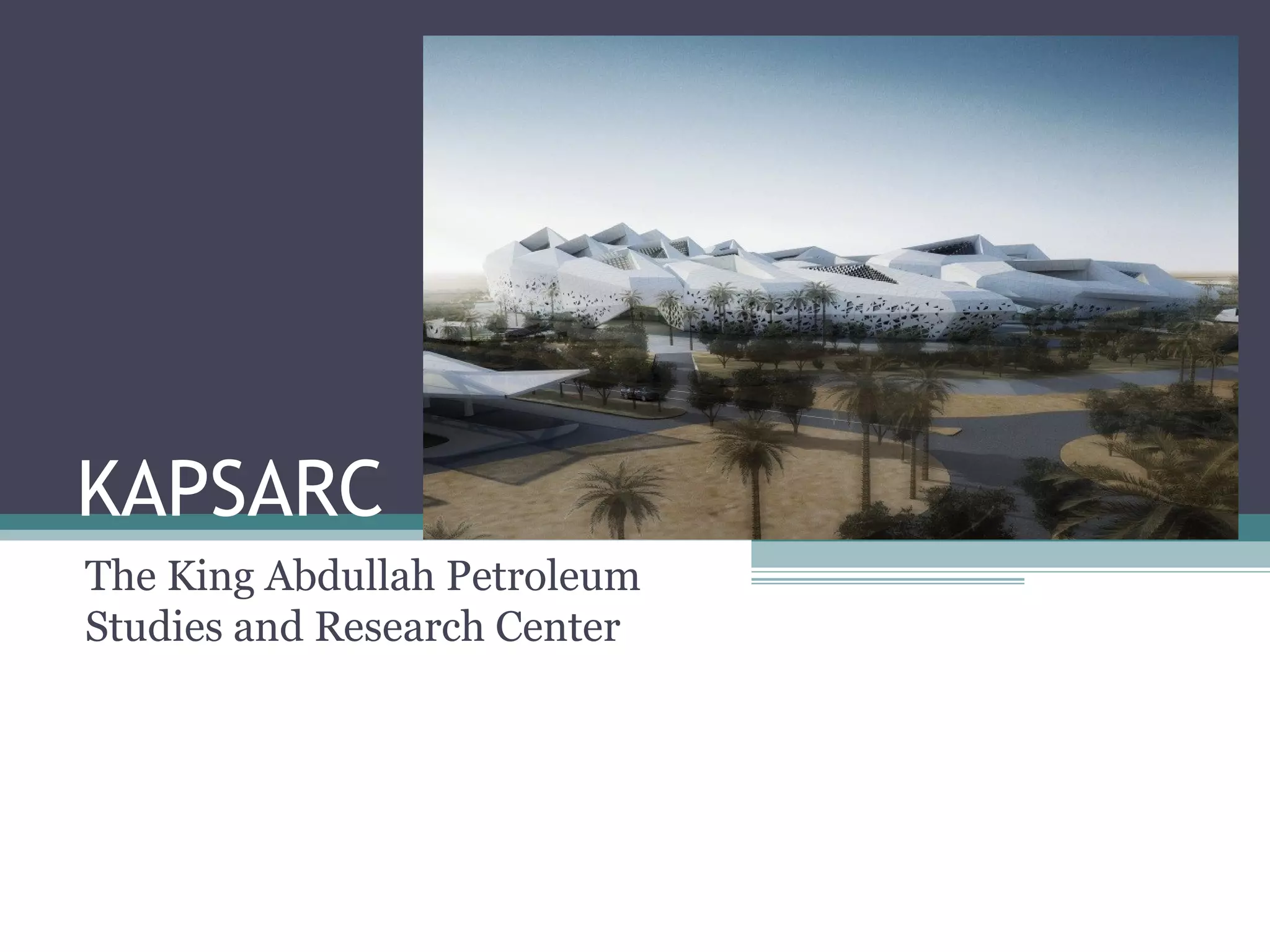 KAPSARC is an independent nonprofit research center in Saudi Arabia focused on energy economics, policy, technology, and the environment. It has a multinational research team studying issues like global energy markets and carbon management. The architectural vision for KAPSARC's building features an organic crystalline structure rising from the desert landscape with a protective shell and soft interior courtyards. Renderings, models, and construction status images of the building are also shown. The architect, Zaha Hadid, was the first woman to win the Pritzker Architecture Prize and is known for her futuristic curved forms evoking modern life.