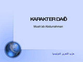 Dokumen tersebut membahas tentang karakter-karakter yang harus dimiliki oleh seorang da'i (penyebar agama Islam), yaitu percaya pada mabda' Islam, berani dan tegas, serius dan sungguh-sungguh, sabar dan teguh jiwa, tak henti terus belajar, tak henti memperbaiki diri, dan bisa bekerjasama. Nabi Muhammad SAW dijadikan teladan utama bagi para da'i karena memiliki semua karakter tersebut.