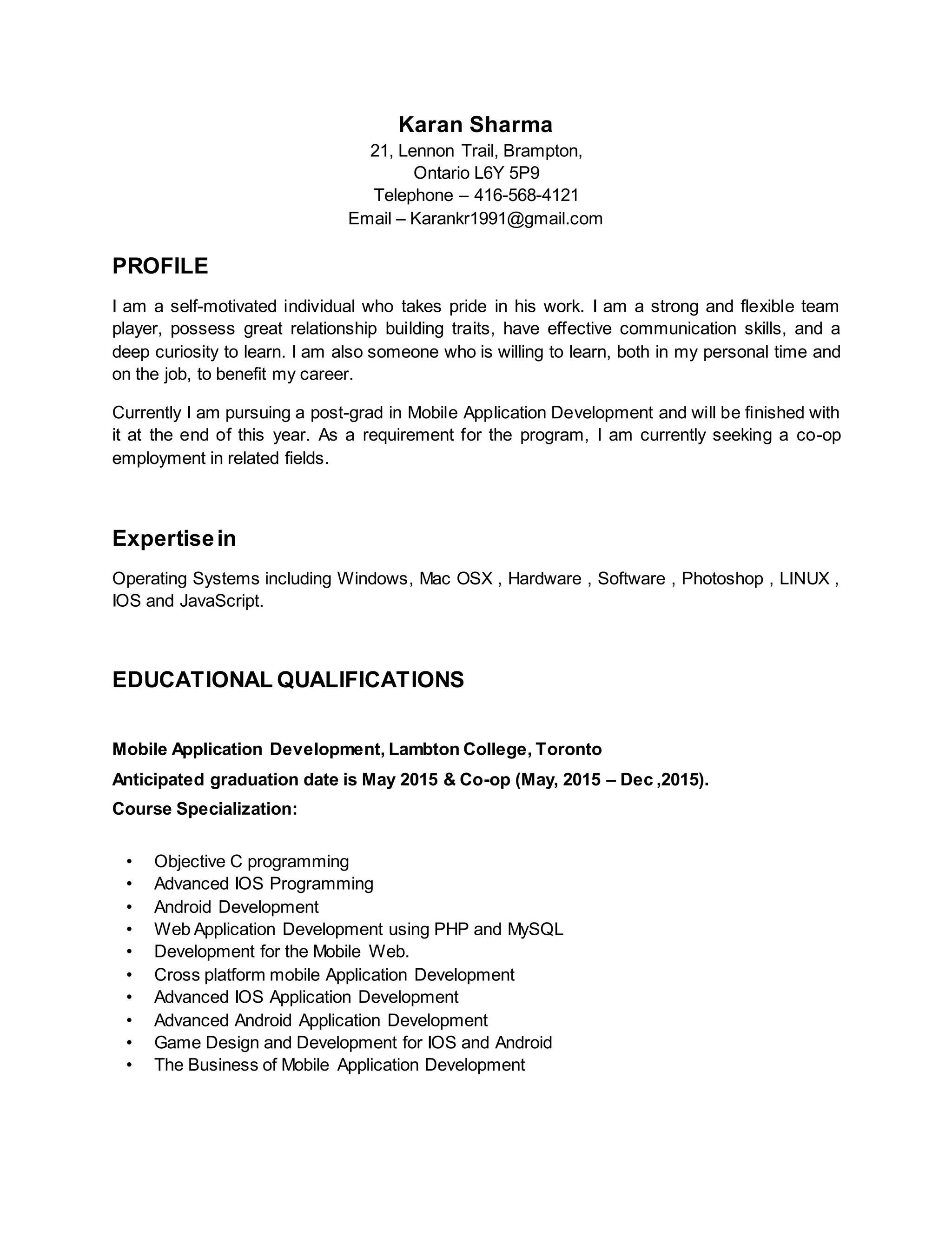 This document is a resume for Karan Sharma, who is currently pursuing a post-graduate degree in Mobile Application Development at Lambton College in Toronto. Karan has expertise in various operating systems, software, and programming languages. He has a Bachelor's degree in Computer Science Engineering from Punjab Technical University and work experience as a visiting faculty member teaching C and C++. Karan is seeking a co-op position related to his field of study.