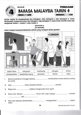 Dokumen ini adalah kertas soalan untuk peperiksaan Bahasa Malaysia Tahun 4 yang mengandungi dua bahagian, A dan B, di mana pelajar perlu menjawab kedua-dua bahagian. Dalam Bahagian B, pelajar boleh memilih untuk menjawab salah satu daripada tiga soalan. Soalan dalam Bahagian A melibatkan aktiviti berdasarkan gambar yang menunjukkan murid-murid membersihkan kelas.