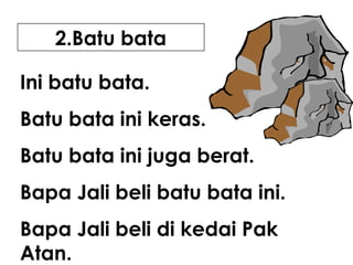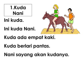 Dokumen ini terdiri dari deskripsi berbagai objek dan hewan, seperti kuda, batu bata, labu, ciku, dahi, raju, buah nona, ikan emas, dan monyet. Setiap bagian memberikan informasi tentang karakteristik atau situasi yang melibatkan objek atau hewan tersebut. Komposisi ini memperlihatkan interaksi antara karakter dan benda di berbagai konteks.