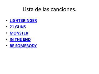 The document contains lyrics from 5 songs that will be performed for karaoke: Lightbringer, 21 Guns, Monster, In the End, and Be Somebody. The lyrics describe themes of revenge/fighting against darkness ("Lightbringer"), heartbreak and inner turmoil ("21 Guns" and "Monster"), struggle and trying hard but ultimately failing ("In the End"), and finding one's identity ("Be Somebody"). The document introduces each song before providing the full lyrics.