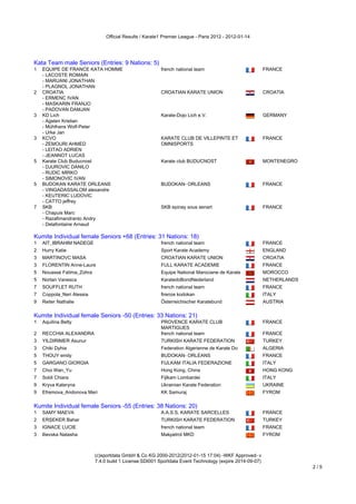 The document provides official results from the Karate1 Premier League competition held in Paris, France on January 14, 2012. It lists the top finishers in each event including kata and kumite competitions in various weight classes and divisions for individuals, teams and seniors. Japan and Venezuela performed well, each winning multiple first place finishes. The results are broken down by event, listing the athlete or team's name, country, and club or federation represented.
