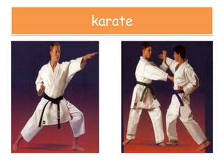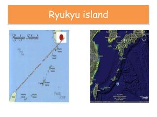 This document discusses the origins of karate and its connections to martial arts from other Asian countries. Karate originated on the Ryukyu islands and was influenced by Chinese kung fu and Korean taekwondo, as the maps of Korea and China suggest cultural exchanges between these regions that impacted the development of karate. The document also mentions hojo undo, which may refer to martial arts training methods used in Okinawa.