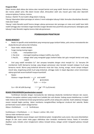 Dokumen tersebut membahas tentang berbagai reaksi kimia yang dapat digunakan untuk mengidentifikasi karbohidrat, seperti reaksi Molisch, Selliwanoff, Tauber, dan lainnya. Reaksi-reaksi tersebut memanfaatkan sifat kimia karbohidrat seperti kemampuannya untuk dihidrolisis menjadi monosakarida penyusunnya.