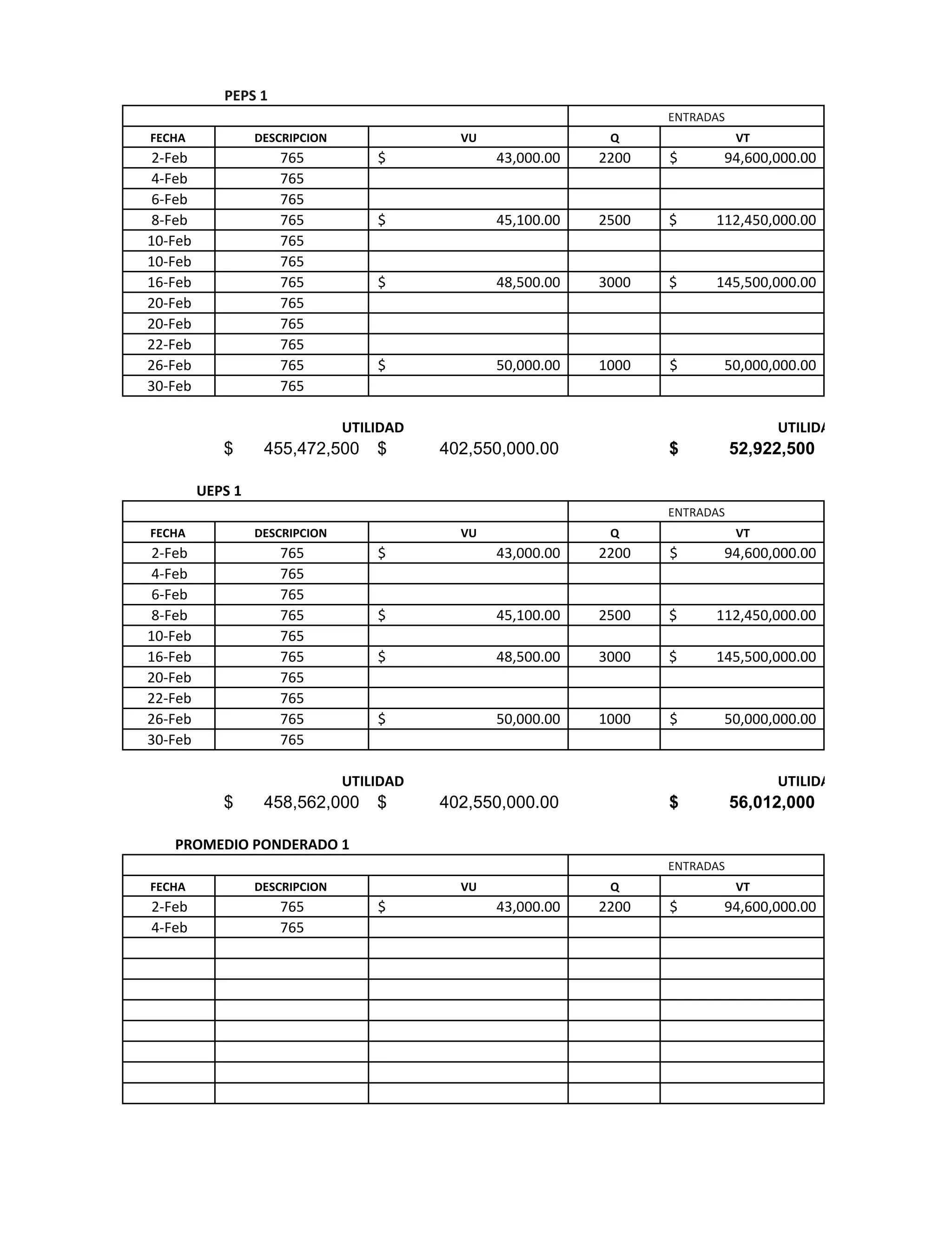This document contains information about profits and losses from transactions of various stocks over multiple dates. It includes details of entry prices, quantities purchased and sold, and resulting profits or losses. The document contains this information for two portfolios, PEPS 1 and UEPS 2, as well as a weighted average calculation. Overall, PEPS 1 resulted in a profit of $52,922,500 while UEPS 2 lost $3,917,720.