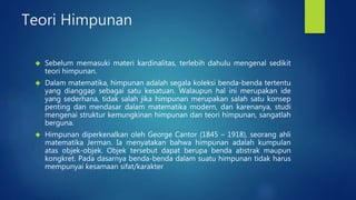 Kardinalitas adalah ukuran banyaknya elemen dalam suatu himpunan. Dokumen ini menjelaskan beberapa jenis himpunan berdasarkan kardinalitasnya, seperti himpunan denumerable, nondenumerable, berhingga, tak berhingga, tercacah, countable, dan uncountable.