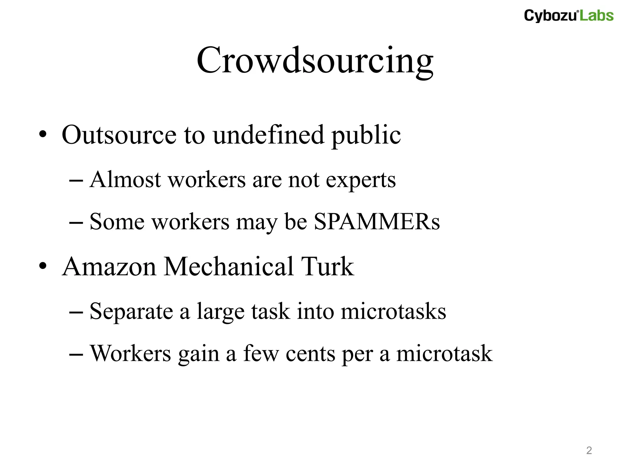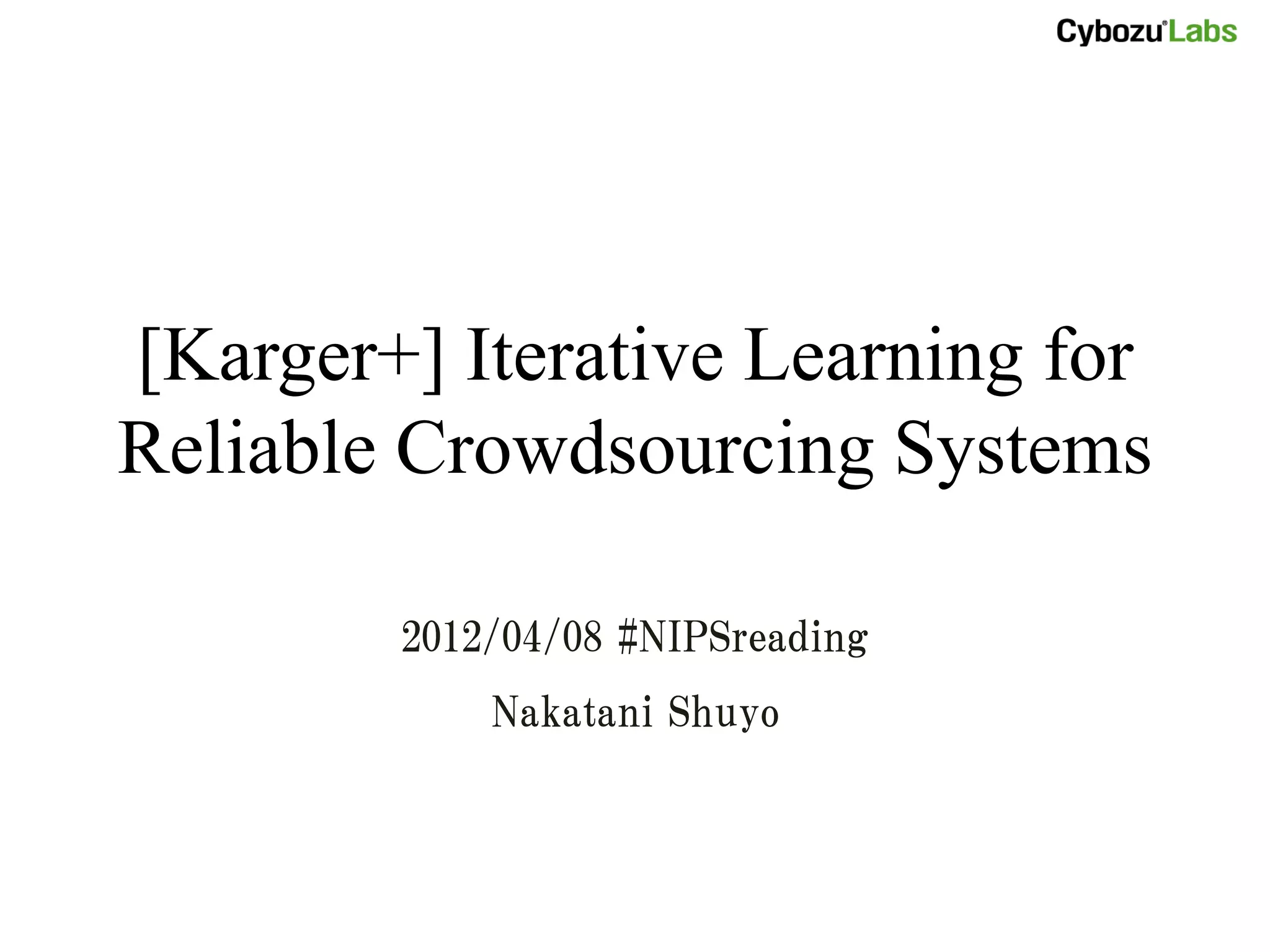 This document discusses methods for improving the reliability of crowdsourced systems by identifying spam workers. It proposes an iterative algorithm that exchanges messages between tasks and workers to predict answers and estimate error rates. The algorithm guarantees an upper bound on error rates that decreases exponentially as the number of iterations increases, allowing highly accurate predictions even with some unreliable workers. Experimental results demonstrate the algorithm achieves lower error rates than other common methods.
