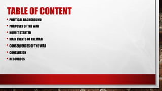 This document provides an overview of the Kargil War that took place between India and Pakistan in 1999. It discusses the political background leading up to the war, how it started with Pakistani soldiers and militants infiltrating Indian territory, and the main events including military engagements and Pakistan's eventual withdrawal. The consequences discussed are the fall of Pakistan's government, rising tensions between political and military parties in Pakistan, and international isolation of the country. Resources for further information are also listed.