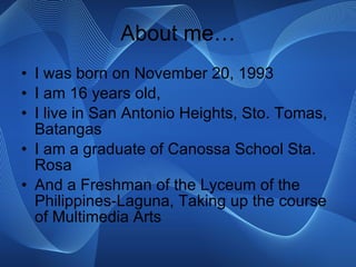 Karl Isaac M. Lacson introduces himself as a 16-year-old student from Batangas, Philippines who enjoys drawing anime and playing video games. He is studying Multimedia Arts at Lyceum of the Philippines-Laguna to further improve his art skills and turn his fantasies into reality. He hopes to get along with others.