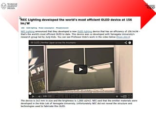 The document discusses the advancements and applications of organic semiconductors, focusing on their efficiency in devices like organic light-emitting diodes (OLEDs) and organic solar cells. It outlines the various properties of organic materials, the challenges of doping, and the notable progress in OLED technology, including device structure and efficiency enhancements. The document also addresses the implications of morphology and material composition in optimizing organic photovoltaics.
