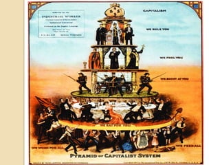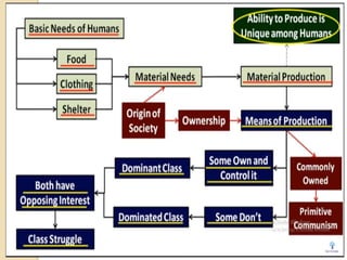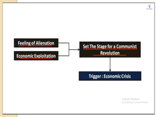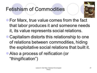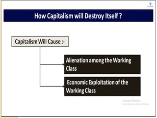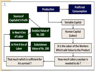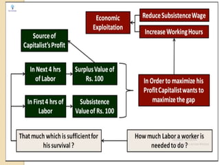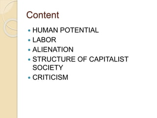 The document discusses Marx's concept of labor and alienation within capitalist society, emphasizing how labor transforms both material nature and human consciousness but becomes alienated under capitalism. It argues that workers are distanced from their labor, the products of that labor, and their human potential due to the capitalists' ownership of the means of production and profits. Additionally, it critiques the implications of capitalistic structures on human relationships and critiques the efficacy of communist theories in practice.