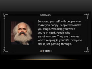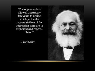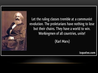 Marxist historiography is a theory developed by Karl Marx that views history through an economic lens. It argues that political and social change is driven by class struggle between the bourgeoisie and proletariat over control of the means of production. The theory aims to use this analysis to empower the working class and bring about a classless society. While it provided important insights, critics argue it oversimplifies human nature and that perfect utopias are unrealistic.