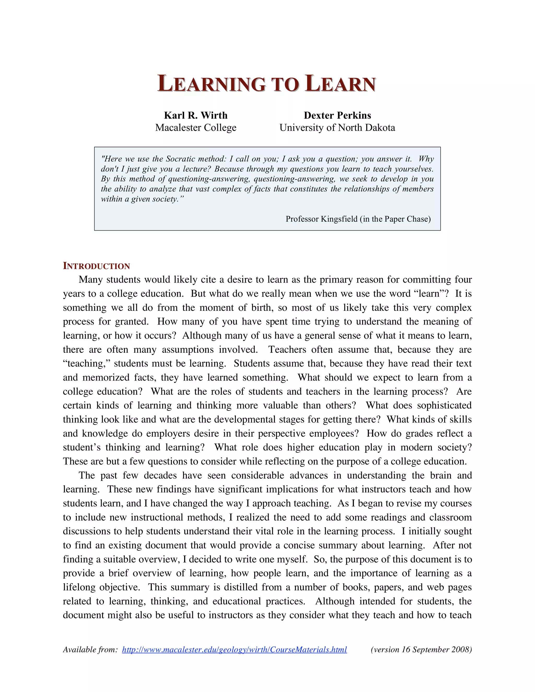 This document provides an overview of learning and discusses the need for new approaches to education. It notes that while college enrollment is high, many students lack important general knowledge and reasoning skills. Studies show current teaching methods are not effective and students often do not retain what they learn. There are calls from employers, educators, and organizations for graduates to have skills like teamwork, communication, problem solving and lifelong learning. The focus of education is shifting from teaching to learning, with teachers taking on more of a facilitator role. The ultimate goal of higher education should be developing students' ability to learn on their own through their lives.