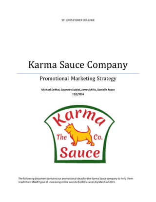 Karma Sauce started in 2008 when neighbors challenged each other to eat local food for a month. They began experimenting with sauces using local ingredients, creating two sauces - Good Karma and Bad Karma. Currently, Karma aims to increase online sales to $1,000 per week by March 2015. A SWOT analysis identified strengths like product quality but also weaknesses such as an inconsistent website. The target market is foodies aged 20-50 in New York and other states. Current promotions include Facebook, radio ads, and festival booths. Hot sauce trends favor Karma due to its natural ingredients. Expanding social media use, especially Pinterest which sees high e-commerce sharing, could help Karma meet its sales goal.