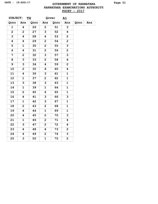 KARNATAKA KARNATAKA EXAMINATIONS AUTHORITY PGCET - 2017 Page 51 A1Qnver 1 2 3 4 5 6 7 8 9 10 11 12 13 14 15 16 17 18 19 20 21 22 23 24 25 26 27 28 29 30 31 32 33 34 35 36 37 38 39 40 41 42 43 44 45 46 47 48 49 50 51 52 53 54 55 56 57 58 59 60 61 62 63 64 65 66 67 68 69 70 71 72 73 74 75 Qnno 4 2 4 4 1 4 2 3 3 2 4 1 3 1 2 4 1 2 4 4 1 3 4 4 3 2 3 4 2 2 2 3 2 4 4 3 2 3 1 4 3 3 2 1 2 2 2 4 2 1 3 4 2 2 3 2 3 4 2 4 1 1 1 1 1 3 1 1 1 3 4 4 2 3 2 Ans Qnno Ans Qnno Ans Qnno Ans TXSUBJECT: