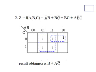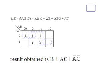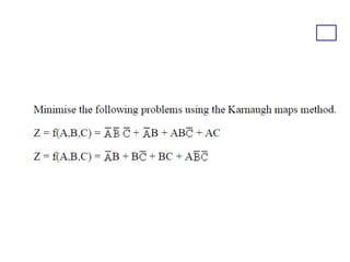 Karnaugh maps (K-maps) are used to simplify Boolean logic expressions. A K-map arranges the minterms from a truth table into an array of cells where adjacent cells differ by only one variable. Groups of adjacent 1s in the K-map correspond to terms in a sum-of-products expression. The process of mapping a logic function onto a K-map and grouping 1s results in a minimum simplified expression. Don't care conditions can be treated as 1s to form larger groups for greater simplification. Both sum-of-products and product-of-sums expressions can be mapped and minimized using K-maps.