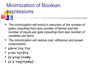The document discusses Karnaugh maps (K-maps), which are a tool for representing and simplifying Boolean functions with up to six variables. K-maps arrange the variables in a grid according to their binary values. Adjacent cells that differ in only one variable can be combined to simplify the function by eliminating that variable. The document provides examples of using K-maps to minimize Boolean functions in sum of products and product of sums form. It also discusses techniques like combining cells into the largest groups possible and handling don't-care conditions to further simplify expressions.